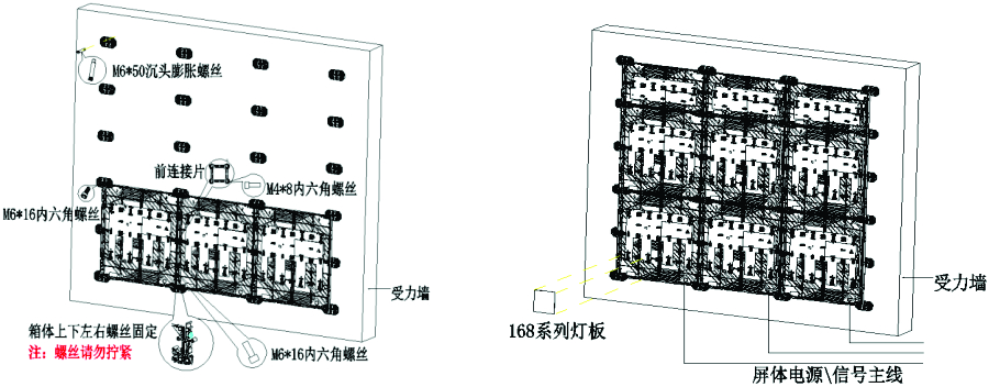 • 箱體固定:膨脹螺絲將連接片固定在受力墻上,再從前面用螺絲穿過后連接片固定箱體;