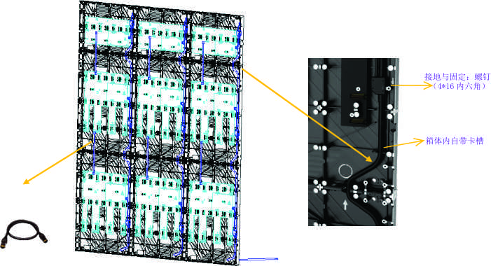 先搭建整屏,再裝配箱體內部電源線,并預留在箱體外一定長度線尾,如上圖示意:主電源線需自行對接延長至配電設備處。